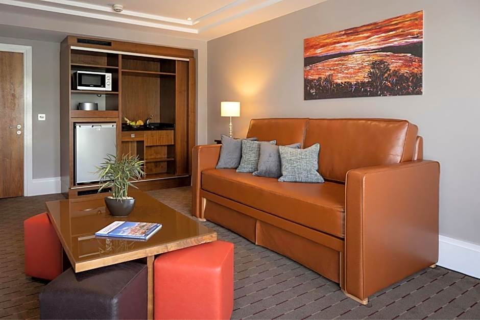 Separate bedroom and living areas, each with plasma-screen TV. Kitchenette has fridge, microwave and toaster.